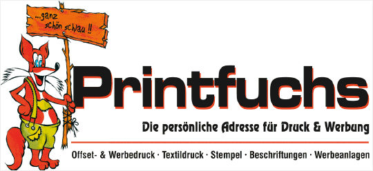 Printfuchs versorgt Firmen und Gewerbetreibende mit Drucksachen, Stempeln, Textildruck, Beschriftungen, Werbeanlagen und Messebau – kurz mit allem, was ein Betrieb braucht. Stark in Service und Qualität - auch im Bereich individueller Kleinauflagen!